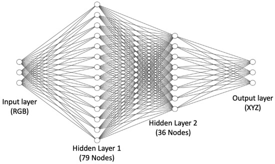 For NN, we used MacDonald and Mayer’s [12] neural network, which has RGB values as input and XYZ as target, the 3 × 79 × 36 × 3 fully connected MLP architecture with two hidden layers as shown in Figure 4. As in the original paper, we used the Adam optimiser with a learning rate of 0.001 to train the network to minimise CIE Delta E 2000 [20]. We had to raise the number of epochs from 65 (used in the original study) to 500 for the neural network to develop a successful mapping because we were working on relatively small datasets. We also used mini-batch gradient descent with a batch size of 8. Our model used 20% of the training data for the validation set and used the early stopping method, which means that the training ends automatically if there is no improvement in validation loss after a specified number of epochs (which in our model is 100) with a call-back function. We chose the best model based on the validation loss. The NN-AUG and NN-EI were trained using the same methodology.
