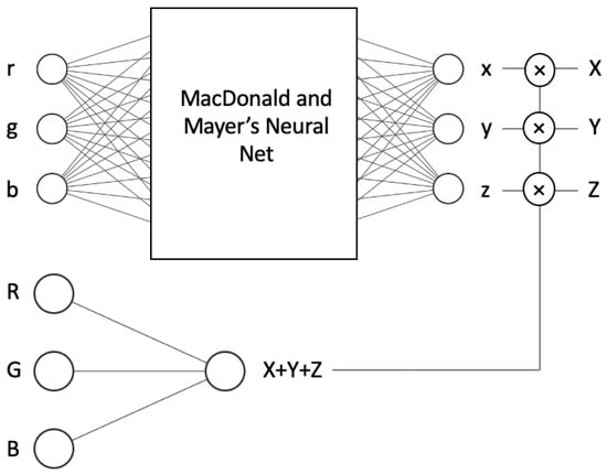 As an alternative to regression methods, colour correction can also be implemented as an artificial neural network. MacDonald and Mayer’s [12] recently published neural network is illustrated in Figure 4 and is a leading method for neural network colour correction.