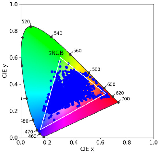 Gamut of the SFU dataset on the CIE 1931 chromaticity diagram. The white triangle shows the sRGB gamut.