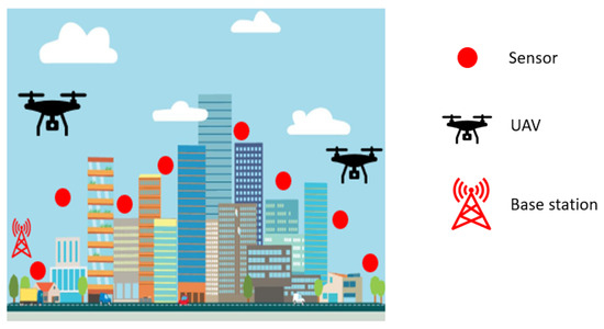 Figure 1 represents the proposed system model of the considered WSN, which includes one base station, sensor nodes, UAVs, and obstacles (i.e., buildings, trees, vehicles, etc.). The sensors are located in pre-determined positions and are randomly distributed within an area. Each sensor periodically generates data and stores them in its buffer until a UAV arrives to collect the data while capturing images and videos. The UAV-captured images and videos are used to train the UAVs to detect obstacles in their tour. Each UAV has a specific velocity and flight duration. These parameters are crucial for ensuring that the UAV can successfully collect data from all the assigned sensors and return to the base station. The battery of a UAV is assumed to be fully charged at the beginning of the tour. Then, after finishing one data collection tour, the UAV battery is recharged from the base station using a wireless method.