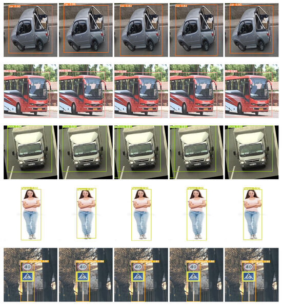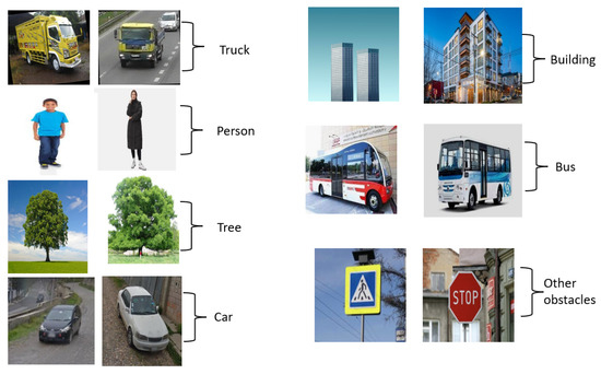 Resizing an image means giving all of the images the same shape. Thus, the custom dataset with all images was resized to 800 × 600 pixels [33,34]. After that, the resized images were labeled according to the seven classes shown in Table 1. The Roboflow annotation operation was applied for labeling data into multiple classes. In Figure 5, we have shown some sample labeled images for each class. Here, in first column, the input images are shown, then in second column the class with a bounded box is shown, and, lastly, the bounded box layer for each class is shown with different colors in last column. The class ID in a bounding box is the name of the obstacle. For example, in this work, the seven class IDs are ‘Truck’, ‘Person’, ‘Bus’, ‘Car’, ‘Tree’, ‘Building’, and ‘Other obstacles’, as displayed in Figure 5. In this case, each bounding box indicates the obstacle, and each class ID represents the type of obstacle.