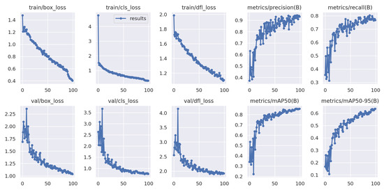 The Yolov8-based training graphs with (a) 100 epochs and (b) 150 epochs are depicted in Figure 8 and Figure 9, showing that the best results are obtained at training step 111 for the proposed scheme. Thus, the decision to train for 150 epochs is based on the observed performance, the early stopping mechanism, and the best results found in 111 iterations. Further, the proposed YOLOv8 exhibits a recall of 78.2%, a precision value of 89.99%, and a mAP of 87.4% when trained with 150 epochs.