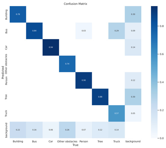 Moreover, Figure 10 depicts the confusion matrix diagram at 200 iterations, where the prediction accuracy is quite high. The confusion matrix is divided into columns and rows, with each column representing a predicted class and each row representing an actual class. The prediction accuracy is highest for the car class, which is 94%, and the lowest predicted accuracy is obtained for the truck class, which is 57%. Thus, the YOLOv8-based model proved its efficacy with the 200 iteration steps, showcasing its potential for real-time obstacle detection in wireless sensor networks (WSNs) aided by UAVs in rigorous testing and analysis.