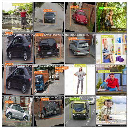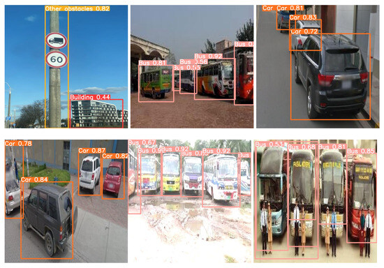 The model training was conducted for a total of 200 epochs. Each epoch represents a complete iteration through the entire training dataset. The training process involves updating the model’s parameters based on the calculated loss and gradients. The model stops at 161 epochs because the best results were found in 111 steps. Thus, the same results repeat for 50 steps, as we have considered the patience parameters to be 50, and, at 161 iterations, the training is stopped. The model training process is completed in approximately 1.843 h. The duration may vary depending on the computational resources and hardware used for training. Some randomly detected obstacles are shown in Figure 11, where training steps are stopped at 161 iterations and the detection accuracy is highest. Furthermore, Figure 12 shows some sample detected images based on the proposed YOLOv8 model for multiple obstacles in one frame.