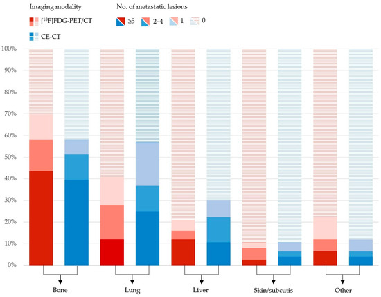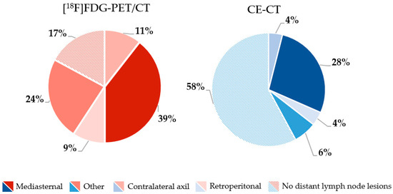 More bone metastases were detected by [18F]FDG-PET/CT compared with CE-CT 53/76 (69.7%) vs. 44/76 (57.9%), whereas CE-CT detected more lung metastases and liver metastases than [18F]FDG-PET/CT 31/76 (40.8%) vs. 43/76 (56.6%) and 16/76 (21.1%) vs. 23/76 (30.3%). Further organ-specific numbers of metastatic lesions are shown in Figure 1. In general, more metastatic lesions in other organs were detected by [18F]FDG-PET/CT, including distant lymph nodes. In the latter, mediastinal lymph nodes were the most common site for metastatic spread (Figure 2).