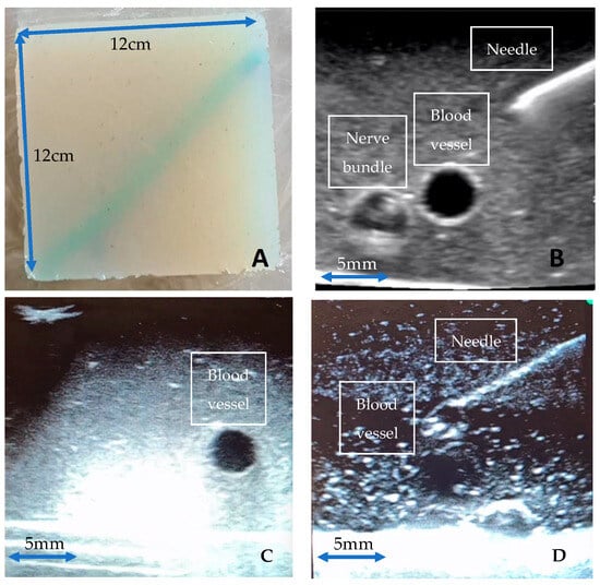 (A): 12 cm × 12 cm Agar phantom model; (B–D): Ultrasound images of Agar models (A–C), respectively, with echogenic needle, simulated vessels, and neurovascular bundles viewed on Butterfly iQ handheld probe.