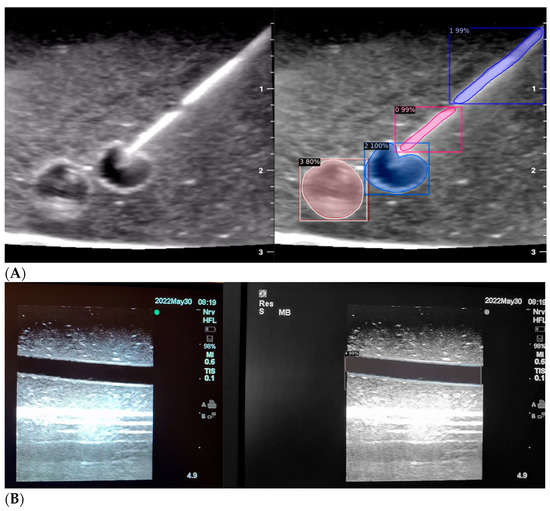 (A,B) AI-based program identifying needle tip (pink), needle shaft (purple), blood vessel (blue), and nerve (red) in ultrasound images.