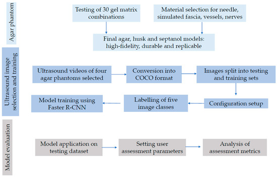 It was written in Python and powered by the Caffe2 deep learning framework [18]. Frame-by-frame images were labelled using “labelme” software (“0” = needle tip, “1” = needle shaft, “2” = transverse section of blood vessel, “3” = transverse section of nerve). Following a randomised test–train split, our program was first trained on 186 frame-by-frame labelled images of needle entry in different agar-based models, then tested on a separate set of 196 unlabelled images from the same mediums (Figure 2).