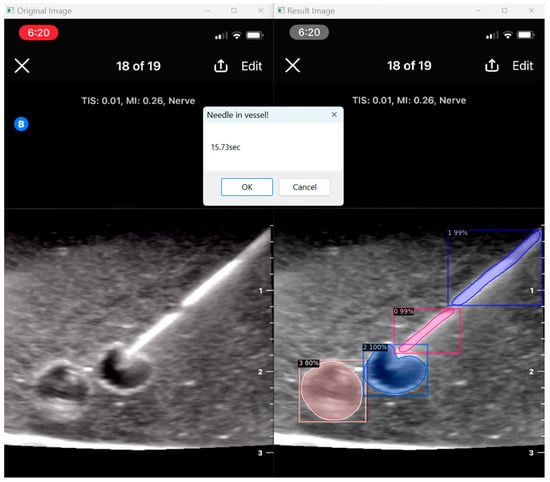 Our image segmentation program has achieved remarkable results, with a prediction factor exceeding 95% in identifying most object classes, especially needle and vessel structures. The prediction factor displayed represents the model’s confidence that the labelled object belongs to a certain object class. However, in a select group of low-quality images, our model displays a low prediction factor, enabling the user to decipher that the labelling may not be accurate in such instances.