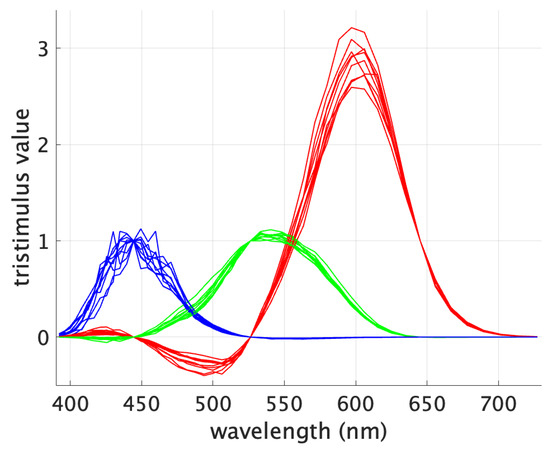 Color-matching experiments have been the most practical and used way to measure color perception. Figure 2 shows the CMFs of a set of 10 individuals from the experiments conducted by Stiles and Burch in 1955 [24]. The tristimulus values correspond to monochromatic primaries at 444.4, 526.3 and 645.2 nm [25].