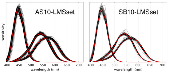 Figure 3. The two 10-deg datasets of cone fundamentals used in the calculations (black lines): AS10-LMSset constituted of 151 individuals (left) and SB10-LMSset (right) constituted of 51 individuals. In both plots, the Stockman and Sharpe (2000) 10-deg cone fundamentals are reported (red lines). All the functions in the two plots are normalized to the same area.