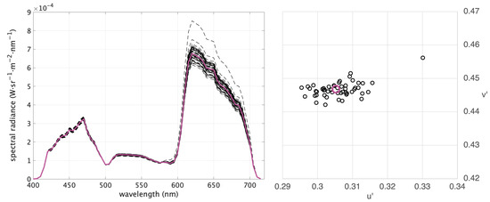 The chromaticity values corresponding to the Q + 1 stimuli (the Q observer metamers s i plus the starting stimulus s ) are calculated considering 2-CMF1931 and plotted in the CIE 1976 UCS diagram [35]. The resulting scatter plot is called the Observer Metamerism cloud (OM-cloud). Figure 4 illustrates a representative example of a magenta stimulus produced with the xenon-arc DLP projector and the 51 observer metamers calculated with SB10-LMSset. The spectra are reported on the left of Figure 4 and the scatter plot on the right is the corresponding OM-cloud.