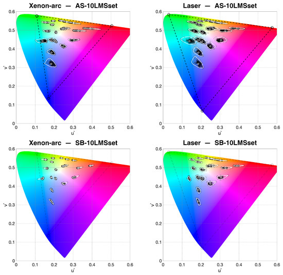 Figure 5. OM-clouds for xenon-arc (left) and laser (right) DLP projectors, whose primaries are reported in Figure 1. The white circles in the center of the clouds correspond to 10-LMS2000 and have the same positions in the two plots. The surrounding black circles correspond to the individual observers. The convex hull is marked in white for all clouds. The values are computed using AS10-LMSset (top) and SB10-LMSset (bottom).