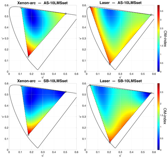 Figure 6. OM-index displayed as heatmaps for the whole gamut of the analyzed displays considering the two different datasets. Xenon-arc on the left and laser on the right, AS10-LMSset at the top and SB10-LMSset at the bottom.