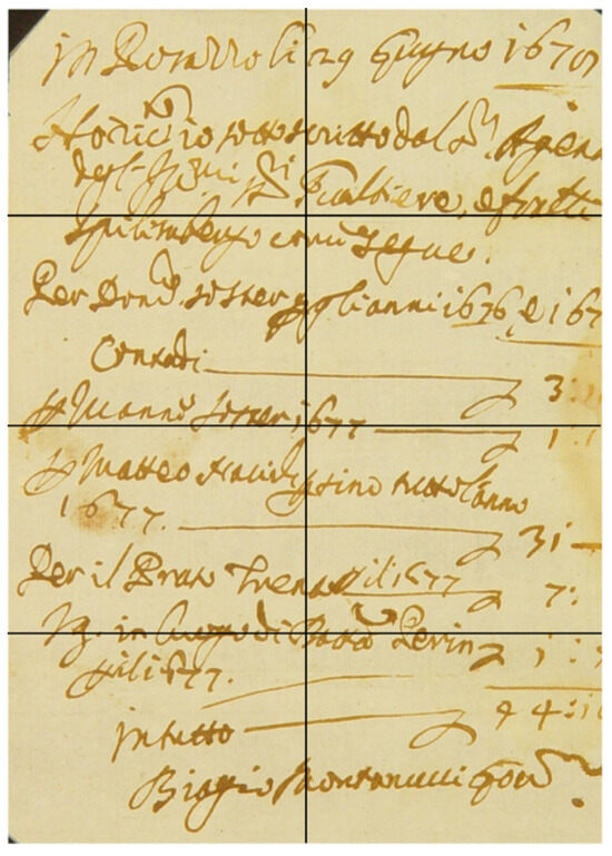 To realistically simulate the case of a closed book, a private Italian handwritten document, shown in Figure 1, dating to 1679 and cm2 in size has been used. The manuscript support is made of paper and the ink is iron-based. Thanks to the heavy elements present in this common European ancient ink type (i.e., iron), the writings have a high X-ray contrast, allowing good imaging of the text. To simulate a multi-page document, the manuscript was folded three times, along the straight lines marked in black in Figure 1, achieving a simulated “eight pages book”, that was put inside a plastic envelope and tied with a string to protect it and keep the fold stable.