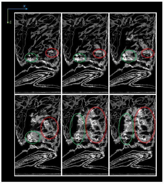 Sequence of six consecutive slices. Two text lines are highlighted by green and red circles, showing their partial reading along different slices.