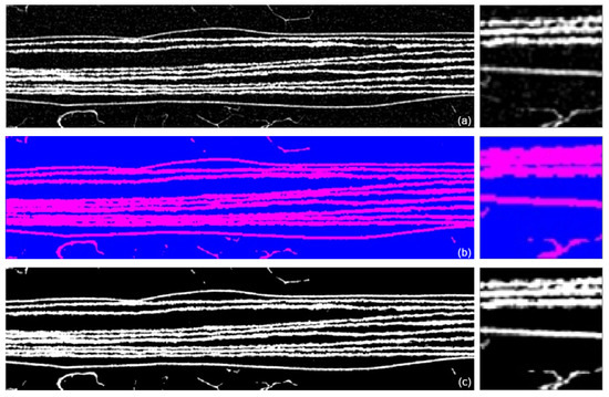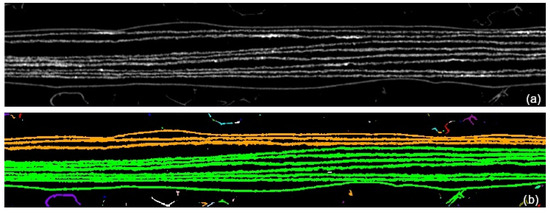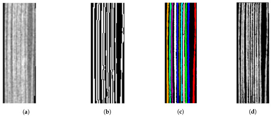 After the image cropping, a noise filter is applied to reduce spurious components: the result is shown in Figure 7a. To identify noisy pixels, we used a segmentation approach already successfully applied in [36], but modified by different filters. The method consists of five steps: