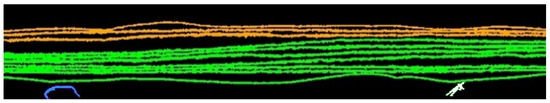 Generally, at the end of the previous step, we do not yet have a correct separation of all the manuscript pages. In fact, several contact points are present at the end of the previous step (see Figure 12). These contact points represent a challenging problem for the correct identification of the single pages. For this reason, parametric segmentation is needed using the pages’ depth. Exploiting Equation (1), we can calculate the mean depth values relative to each classified zone. The results are listed in Table 2.