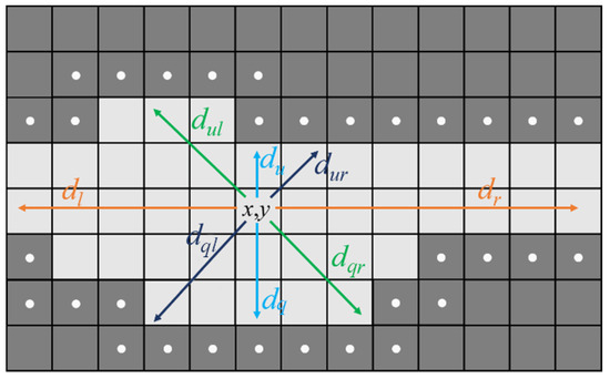 In this procedural phase, in order to identify contact pixels, geometric features will be defined and calculated. For each signal pixel , its distance from the closest background pixels can be calculated in eight directions: up, down, right, left and the four diagonals. These distances are defined using the minimum of the well-known Euclidean metric, in the following way: