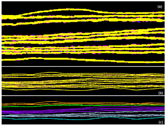 (a) False-colored visualization of the geometric features computed for each pixel of Figure 8: the yellow color individuates the pixels for which the Principal Direction is horizontal, cyan the ones for which the Principal Direction is vertical, blue the ones for which the Principal Direction is positive diagonal and, finally, light green the ones for which the Principal Direction is negative diagonal. Fuchsia pixels are instead pixel with Principal Direction different from their neighbors and, consequently, they are most likely contact pixels. (b) The same as (a) for the whole area of Figure 8. (c) Result of the classification after the elimination of the individuated contact pixels: five different zones are clearly distinguishable in different false colors, individuating distinct pages (orange, green, purple, light gray and cyan).