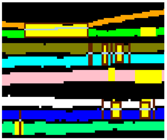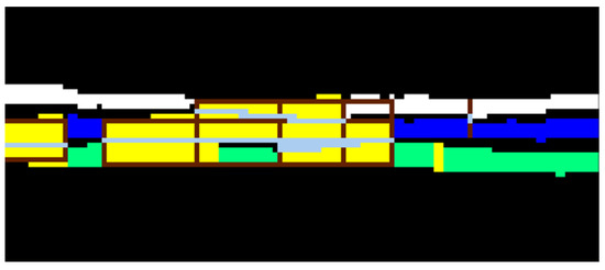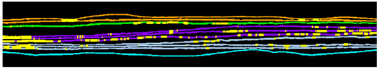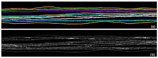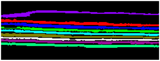 After the suppression of the spurious areas, characterized by a reduced extension, the number of connected zones results lower than the number of pages. An example of page classification is shown in Figure 8b, and achieved processing in Figure 8a. If the pages were completely separated, there would be no need to continue processing, and the software could go directly to the data extraction step, but, as shown in Figure 8, they are in contact in some points and the algorithm tends to underestimate the number of actual pages (only two instead of eight). This is due to the compression of the manuscript and the lack of space between the pages themselves. Further steps of the algorithm are needed for the identification and removal of contact points and impurities.
