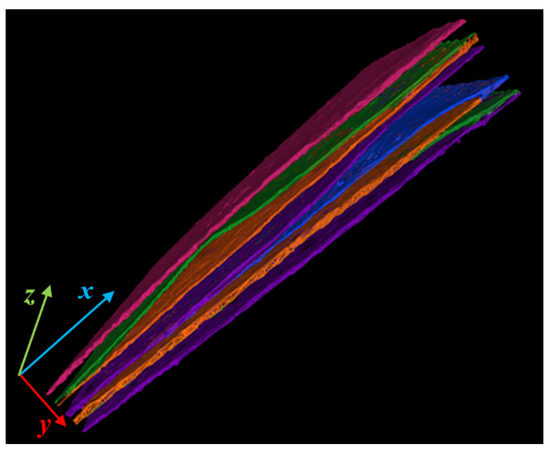In Figure 25, a sagittal section of the reconstruction of the envelope is shown. Again, the non-homogeneity of the writing support poses a serious problem to the extraction of the pages. Subsequently, in Figure 26, the final segmentation of the pages is presented, each page with a different color.