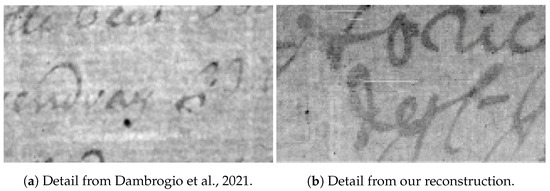 A quantitative evaluation of the wrongly extracted pixels has been performed, and has resulted in a correctness of reconstruction of around of the whole document. The missing is mostly localized close to the foldings. Compared with the state of the art (e.g., [25]), our algorithm provides better results, in terms of resolution and image definition: the grain of other texture is visible without any degradation thanks to the high signal-to-noise ratio; the ink distribution is not altered. Moreover, we underline that the techniques also works well when the distribution of the ink is not uniform on the page.