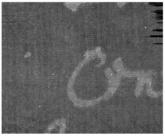 Then, the same procedure described in the previous points (a) to (d) is applied using a Median filter, calculating the median in the neighborhood S. At the end, a segmentation threshold is chosen to suppress the lower values pixels in the background. The described filtering procedure has been applied to our specific problem choosing for both filters , and a of around of the maximum gray value. An example proving the effectiveness of the proposed pre-filtering procedure is shown in Figure 7 (values are normalized to improve the visual readability). This algorithm decreases the noise without damaging the page signal at higher values.