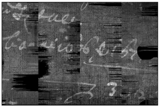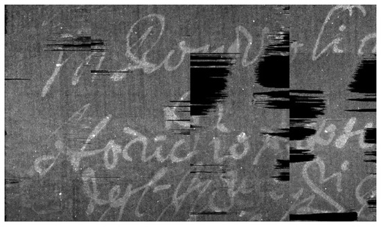 Two extracted pages are shown in Figure 18 and Figure 19. The black areas in Figure 19 and Figure 20 are due to the failure of the propagation step (e.g., in those pixels with low value), while the horizontal black area in Figure 18 is due to the crop in proximity of the folds, where the geometry considerably changes. Moreover, attenuation in the recorded signal can cause a wrong classification of some pixels: if this behavior propagates, then some misclassified areas can appear, like, e.g., the vertical black ones in Figure 19. In our analysis, we are interested in extracting the planar zones of the text. In case of CT of whole books, this problem is avoided thanks to the constructive morphology of the book itself, where the pages are planar to certain extent and where no text appears on the binding of the pages. On the contrary, in books analysis, we expect less air space between pages; therefore, it will be necessary to test and adapt the method to books in future.