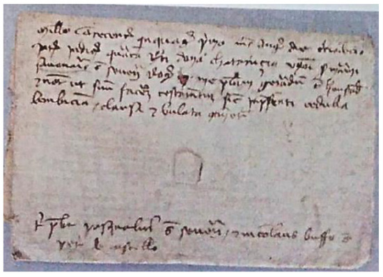 A single scan of the envelope of the Venetian testament from the Archivio di Stato in Venice. The image histogram has been stretched to put the envelope better in evidence. The seal (the big spot in white) and the ring artifacts are clearly visible.