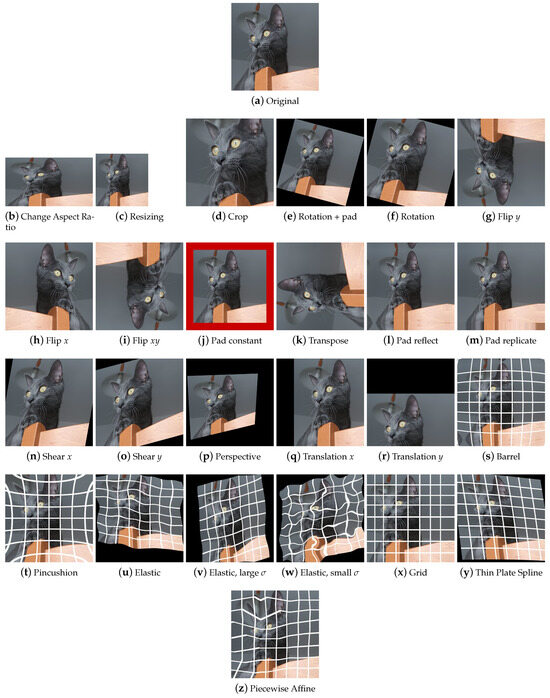 - Computer Vision—Data augmentation is extensively employed in computer vision tasks, such as image classification, object detection, and semantic segmentation. By applying transformations like rotations, translations, flips, zooms, and color variations, data augmentation helps models learn to recognize objects from different perspectives, lighting conditions, scales, and orientations [1,2,3,4]. This enhances the generalization ability of the models and makes them more robust to variations in real-world images.