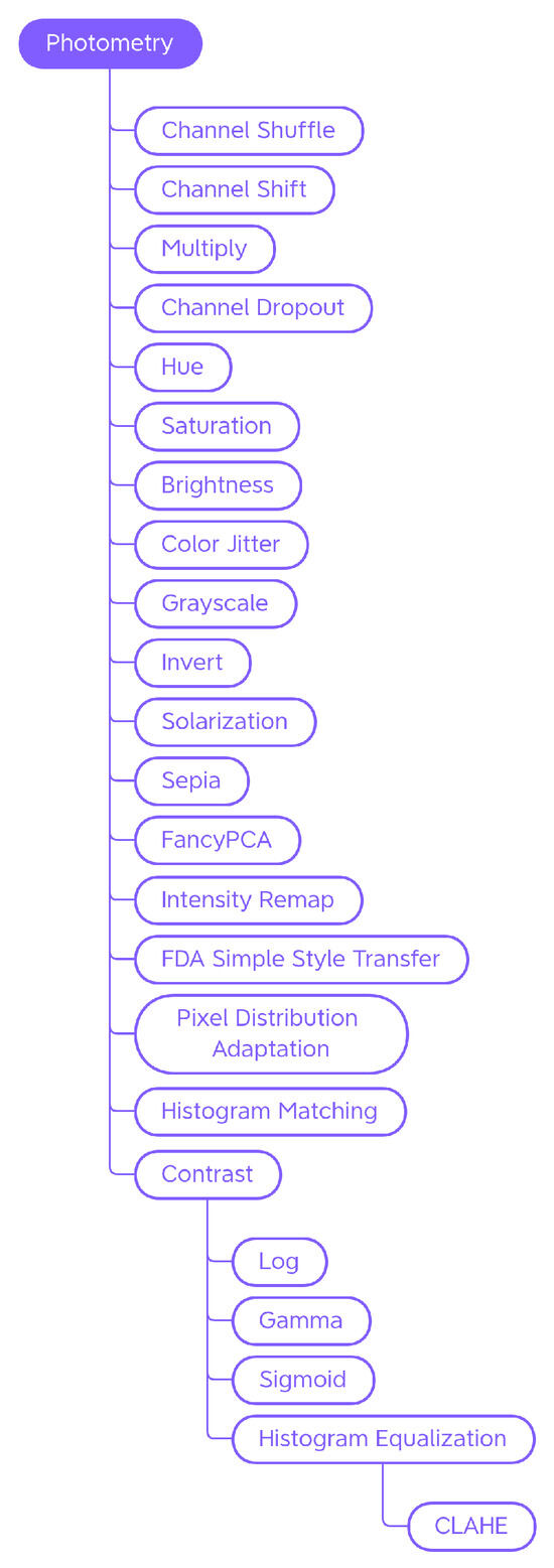 Albumentations [21] is a Python library for image augmentation, first released in 2018, which boasts of being particularly fast and flexible. The library is part of the PyTorch ecosystem and can be integrated with deep learning frameworks like PyTorch and Keras. Image transformations fall in two macro-categories: pixel-based, which effect image contents, and spatial-based, which change image structure. Between the two categories, we have identified 83 image transformations (ignoring basic data type modifiers and support ones). The authors of the library adopted a set of design principles to provide a balanced approach that addresses current needs in data augmentation. These five principles are: Performance, which is guaranteed by using a vast number of dependencies in order to relay on the best-in-class implementation for each base transformation; Variety, to provide a vast, diverse, and combinable set of image transformations in order to support different use case scenarios; Conciseness, by providing a simple interface to the user and hiding the complexity of the transformations; Flexibility, to guide the development of the library by quickly adapting to the evolving needs of researchers and companies; and Open-source, to allow the easy reproduction of results and to build a solid code-base. By sticking to those principles, the authors provide a general-purpose library that implements the most-common image transformation operations as well as a vast set of generic and domain-specific augmentation techniques. It also includes methods from Automold to enhance street images. With Albumentations, it is also possible to increase masks, bounding-boxes, and key points (limited to the applied transformation).