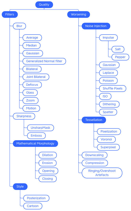 The internal classification of these classes was then perfected, determining the various subcategories: Geometry has been divided into Basic Geometry, which contains the simplest and best known geometric transformations, and Distortion, which contains techniques that deform the image by modifying the internal geometry; Photometry has no subcategories, but we wanted to highlight that although many libraries include methods that allow you to modify the contrast in a generic and immediate way, there are also more specific techniques to achieve the same goal; Quality is divided into Filters and Worsening. Filters contains blur filters, sharpening filters, mathematical morphology techniques, and what we have defined as style filters. Worsening contains techniques that aim exclusively at image deterioration and contains the subcategories of noise injection and tessellation; Miscellaneous is divided into Regional Dropout and Composition. In the latter, there is a further subcategory that includes the various types of Mixed Sample techniques.