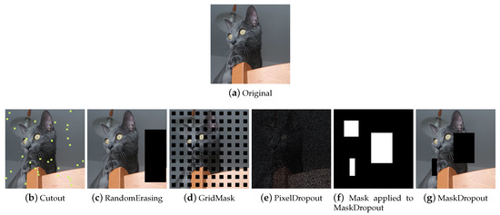 - DeVries, T.; Taylor, G.W. Improved Regularization of Convolutional Neural Networks with Cutout. arXiv 2017, arXiv:1708.04552. [Google Scholar]