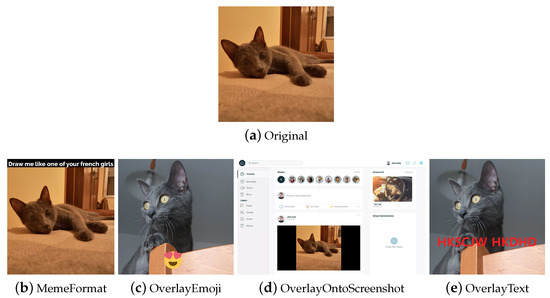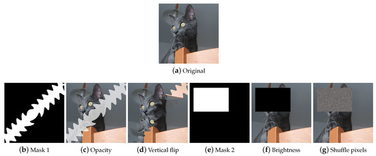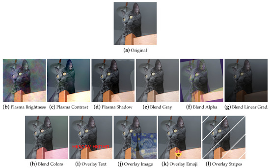 - Papakipos, Z.; Bitton, J. AugLy: Data Augmentations for Robustness. arXiv 2022, arXiv:2201.06494. [Google Scholar]
