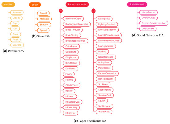 The task-driven techniques encountered in the analysis of the libraries are traditional ones. They have been divided according to the fields of use: Weather contains techniques involving image effects that simulate atmospheric phenomena such as rain or fog; Street includes methods that add street elements such as gravel or manhole covers to the image; Paperdocs encompasses paper document methods, which produce realistic and dirty copies of paper documents from loose copies of artifacts; Social Network includes transformations related to social networks, which produce images similar to those typical of social networks, such as captured screenshots or memes.