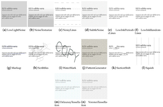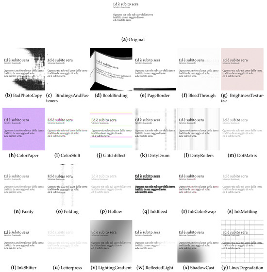 - Groleau, A.; Chee, K.W.; Larson, S.; Maini, S.; Boarman, J. Augraphy: A Data Augmentation Library for Document Images. arXiv 2023, arXiv:2208.14558. [Google Scholar]