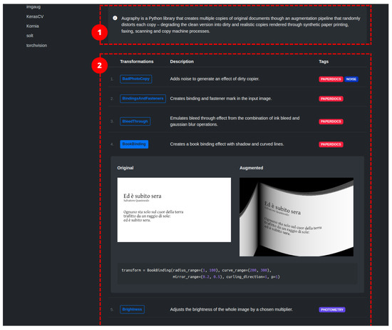 Augraphy [24] is an image augmentation library written in Python that synthesizes images related to paper documents, scans, faxes, prints, and photocopies. The augmentation pipeline is highly configurable. It starts from a clean document by extracting text and graphics from the source to create an ink layer. After the creation of the ink layer, the augmentation pipeline proceeds to manipulate and deteriorate the text and graphics through distortion and degradation techniques. At the same time, it is possible to generate a paper texture layer, which, in turn, can be processed via a pipeline. The two layers are combined, resulting in an image that can be further enhanced by introducing creases, distortions, or other effects. The image transformations comprise standard transformations operating at pixel level, and deterioration of the document appearance by incorporating visual distortions such as glitches, ink-related issues, scribbles, and cast shadows, among others. In total, we have identified 26/40 image transformations in the library. The library does not directly support specific machine learning frameworks; however, it works with NumPy arrays that can be easily converted to formats used by those frameworks.