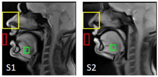 We have observed some differences in the quality of the resulting images of different volunteers. In particular, the images were less sharp with more artifacts related to the inter-slice inconsistency. These distinctions might be explained by the natural difference in the volunteers’ speech; however, it is more likely that these differences are related to the acquisition protocol choice. The first evidence that supports this conclusion is the pronounced difference in articulation in the left and the right slices of S1 (see Figure 4 and Figure 5). These variations can be perfectly explained by the acquisition order (see Figure 1 for the reminder). The temporal difference between the central and the adjacent on the left slice was on the order of 30 min. This delay might affect S1’s speech properties. Another sign that points to the protocol’s importance is the distribution of the sharpness index across different slice positions. The central slices of S1, which are the most sensitive to articulators’ positions, demonstrated a sharpness much lower than that of the native 2D images. The gap between the super-resolved and the native 2D images of S2 was, on the contrary, almost constant over the slices. Finally, the initial 2D images of S1 contained more motion artifacts which migrated into the super-resolved images. These artifacts could be due to the higher speech rate in the absence of visual stimuli.