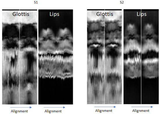 Examples of visualization of the alignment quality in two different coronal planes: the glottis region (on the left for each subject) and the lips region (on the right for each subject) for S1 and S2. The non-aligned slices are on the left of each pair and the aligned ones are on the right of each pair.