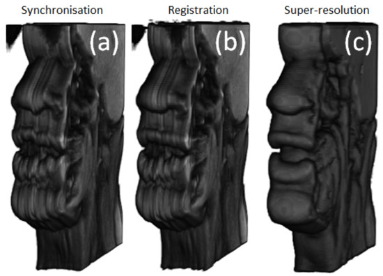 A rendered 3D volume of S1 illustrating different processing steps. (a) After temporal alignment only. (b) After rigid registration. (c) After super-resolution application.