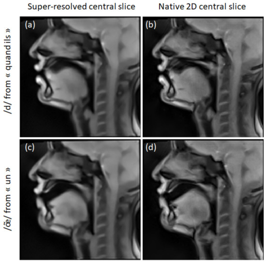 Figure 8 shows super-resolved and 2D mid-sagittal images of S2. One can notice a texture difference: the super-resolved images are smoother due to edge regularization and denoising. This effect is especially visible in stationary regions, such as the brain. In some cases, super-resolution improved the visualization of some articulators (like the soft palate in Figure 8a,b). In other cases, super-resolution decreased the region’s sharpness (like the tongue tip in Figure 8c,d).