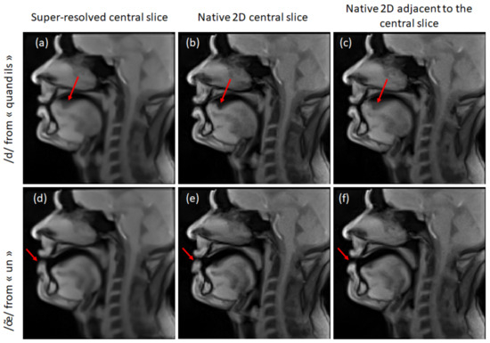 S1 demonstrated a worse super-resolved image quality. Some typical cases of its failure are presented in Figure 9. It can be seen that the tongue dorsum region is much sharper in 2D images (Figure 9b) than in the super-resolved images (Figure 9a). This can be explained by the migration of a motion artifact from an adjacent slice (Figure 9c). Another typical case is the difference in articulation (poor inter-slice reproducibility). The comparison of two adjacent slices shows a difference in the lips opening (Figure 9b,c). The resulting super-resolved image demonstrates a blur located between the two lips positions.