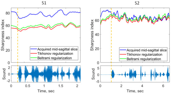 Upper plots: examples of sharpness index change in time for mid-sagittal slices of S1 and S2. Lower plots: corresponding sound recordings. The dashed vertical orange line shows the beginning of the speech.