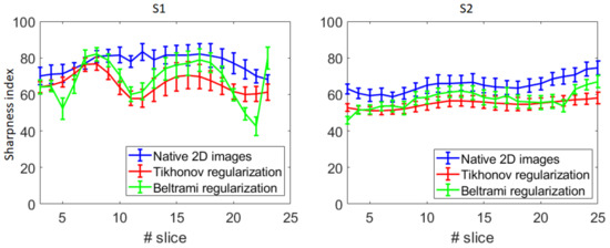 The sharpness index dependence on the slice is presented in Figure 11. It can be seen that in the case of S1, the images around the mid-sagittal slice demonstrate lower sharpness. In contrast, in the case of S2, the sharpness has an almost uniform distribution.