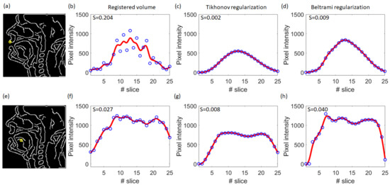 Illustration of the smoothness evaluation steps on highly mobile and moderately mobile regions for S1. (a) Results of the Canny edge detection on the mid-sagittal slice image from the super-resolved volume with Tikhonov regularization. The yellow circle indicates the position of a highly mobile region (upper lip) corresponding to the curves (b–d). (b) Pixel values (blue circles) and the smoothing spline fitting curve (red line) for fixed in-plane position for different slices extracted from the registered volume. (c) The same as (b) extracted from the super-resolved volume with Tikhonov regularization. (d) The same as (b) extracted from the super-resolved volume with Beltrami regularization. (e–h): The same for a moderately mobile region in the tongue body. The values in the upper left corner correspond to the smoothness metrics.