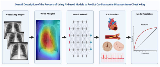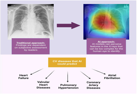 Wide availability, low cost, low radiation dose, and simple image acquisition make CXR an important test for the application of AI technologies for the detection of cardiovascular diseases and for prognostication. Indeed, features from CXR have been analyzed in novel AI-based studies to predict clinical information, including mortality, cardiovascular morphology and function, coronary artery disease (CAD), valvular heart diseases (VHDs), aortic diseases, arrhythmias, pulmonary hypertension (PH), and HF [1]. This narrative review aims to summarize and analyze the available data regarding the use of CXR in AI models for the prediction of cardiovascular conditions and outcomes.