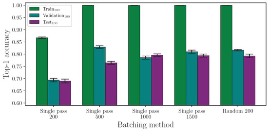 14] showed that, for this task, the majority of models trained using random batching converge at around 130 epochs, and we can expect all models trained using this method to converge by approximately 250 epochs. It is therefore possible that, at 200 epochs, some of the random batching experiments had not fully converged before training had been completed. Nevertheless, given enough iterations through the data for single-pass batching (e.g., ∼1000 epochs), both methods are comparable in terms of performance on the test set. Using the number of epochs as a metric for time to train can be misleading, however, because random batching, in practice, makes multiple iterations through the majority of the entire dataset per epoch, and in doing so, each epoch takes more time to complete than with the single-pass batching method.