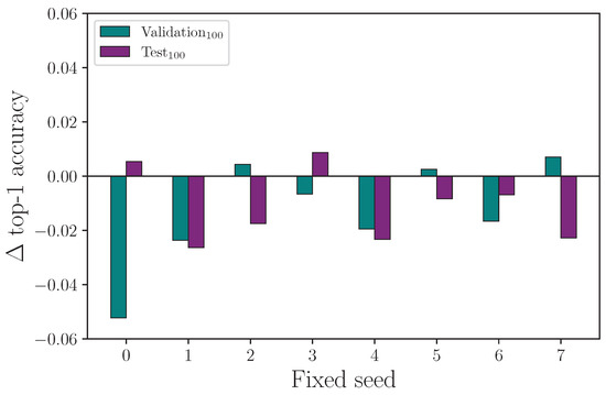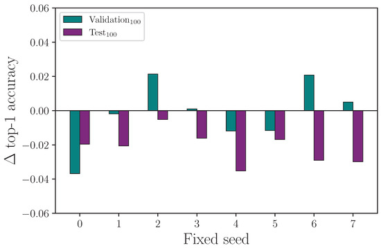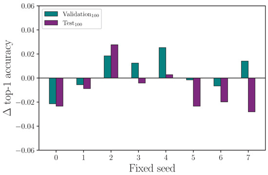, we plot the change in outcome for the validation and test sets for each given fixed seed such that a positive value means an improved accuracy was observed. We omit the training set outcomes because the difference is negligible.