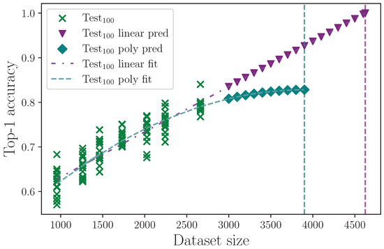 . Using these equations, we predict mean accuracy at increased dataset sizes up until the model reaches 100% accuracy on the linear fit, and until the model reaches a peak on the polynomial fit. These results are shown in